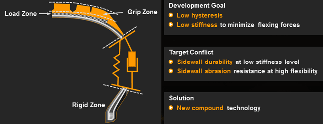 Die Seitenwand eines Reifens beeinflusst viele Aspekte seiner Performance, vom Fahrgefühl über den Komfort und die Übertragung von Fahrgeräuschen in den Innenraum bis hin zum Kraftstoffverbrauch. Die Balance zwischen Lenkpräzision und Komfort ist schwer zu finden. Um dies zu erreichen, hat Continental die Gürtelkante und den Schulterbereich intensiv überarbeitet und den Rollwiderstand deutlich reduziert. Zudem ist es Continental gelungen, die Seitenwand flexibler zu gestalten, um den Komfort zu erhöhen, während der Wulstbereich verstärkt wurde, um die Fahrpräzision zu erhalten.