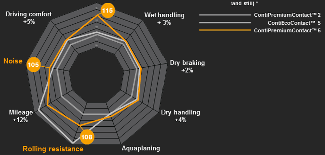 Der Premium Contact 5 wurde für kleine bis mittelgroße Fahrzeuge entwickelt und zeichnet sich im Vergleich zu seinem Vorgänger durch hervorragende Bremsleistung bei Nässe und einen geringeren Rollwiderstand aus. Er ermöglicht einen 15 % kürzeren Bremsweg und verbraucht 8 % weniger Kraftstoff. Um dies zu erreichen, nutzt der Premium Contact 5 eine Reihe neuer Fertigungstechniken im Profil und in der Seitenwand des Reifens.
