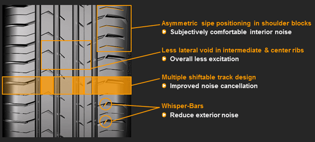 Viele glauben, das Reifenprofil beeinflusse die Haftung, doch seine Hauptfunktion besteht darin, Wasser bei Nässe abzuleiten. Zu diesem Zweck schneiden Reifenhersteller Rillen in das Profil, was den Rollwiderstand und die Geräuschentwicklung erhöht. Continental hat diese Nachteile mithilfe mehrerer intelligenter Technologien, die im Folgenden beschrieben werden, minimiert.