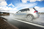 Bei den Aquaplaning-Tests in Kurven fuhren wir zwei VW Golfs mit konstantem Radius bei 80 km/h in ein 8 mm tiefes Wassergebiet. Ohne die Lenkbewegungen zu verändern, maßen Laser die durch Aquaplaning verursachte seitliche Abweichung des Fahrzeugs. Der Goodyear-Reifen driftete im Durchschnitt 3,4 Meter über 20 Fahrten, der Michelin-Reifen weitere 1,2 Meter, im Durchschnitt 4,6 Meter.