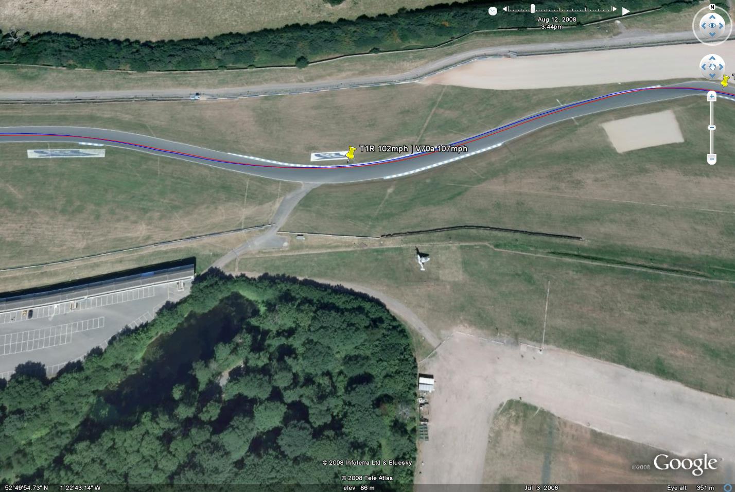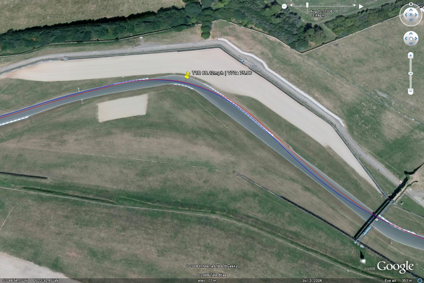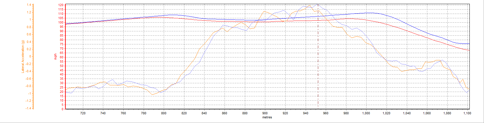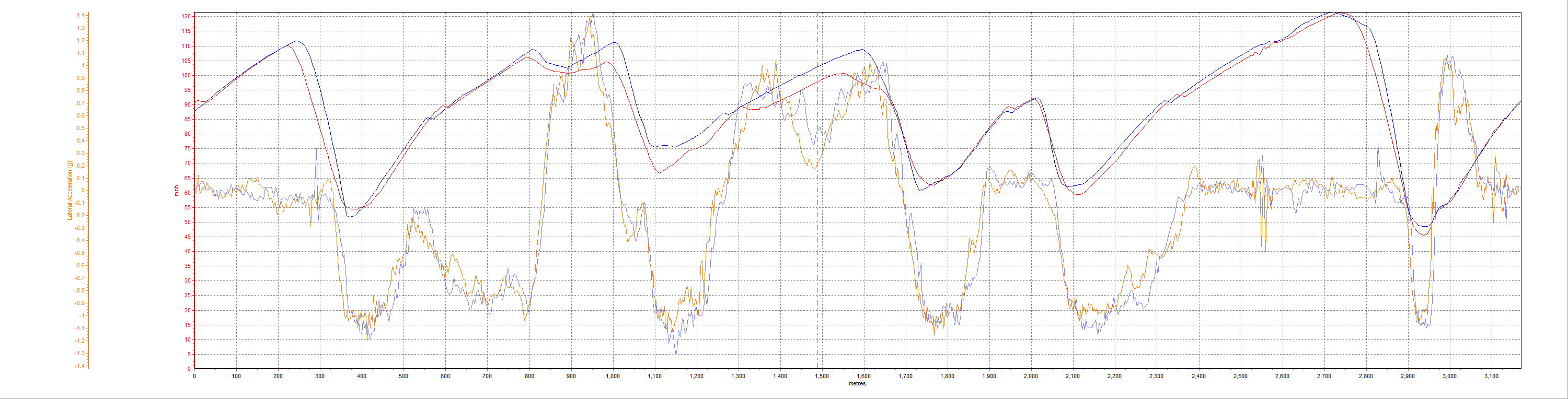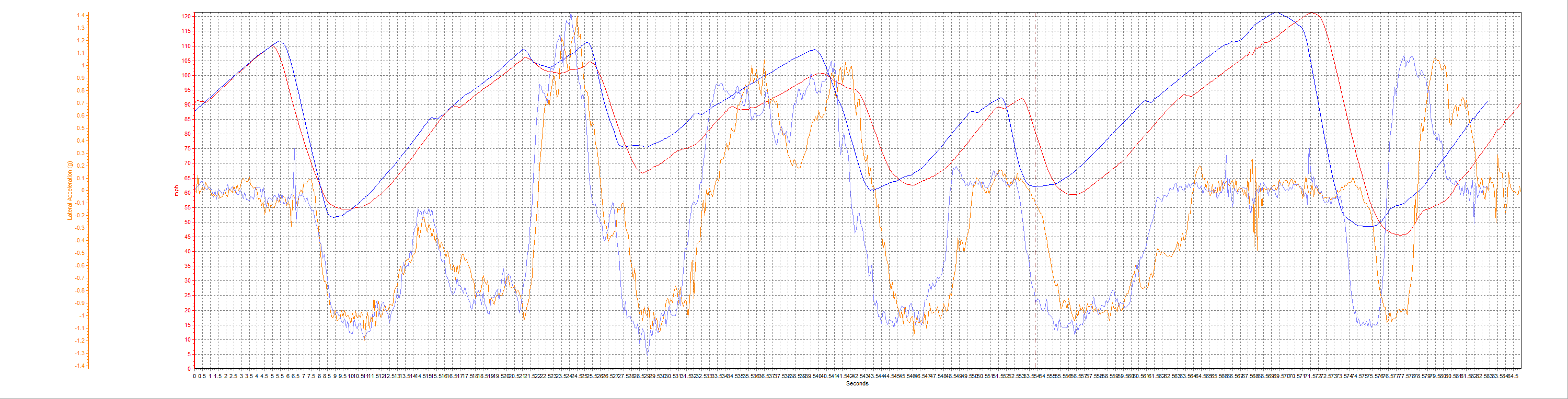 Klicken Sie bitte, um die Bilder in voller Größe anzuzeigen. Die blaue Linie stellt die Rennstrecke Kumho V70a dar, die rote Linie die Straße Toyo T1R. Die meisten Diagramme enthalten auch eine Kurve der Querbeschleunigung.