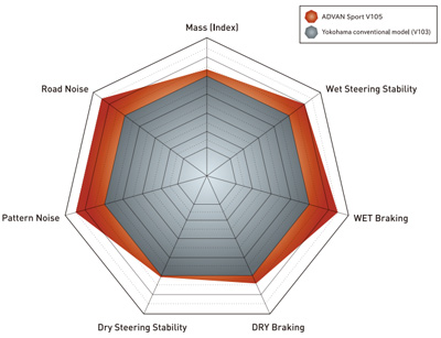 Ausgehend vom V103 als Maßstab haben die Yokohama-Ingenieure unermüdlich daran gearbeitet, den Nachfolger V105 so zu entwickeln, dass er nicht nur in puncto Grip besser ist, sondern auch ein verbessertes Fahrgefühl und mehr Sportlichkeit bietet. Dafür wurde viel Zeit in die Entwicklung auf dem Nürburgring investiert. Das Ergebnis ist ein deutlich verbesserter Reifen.