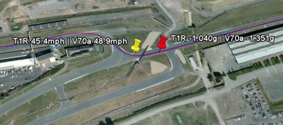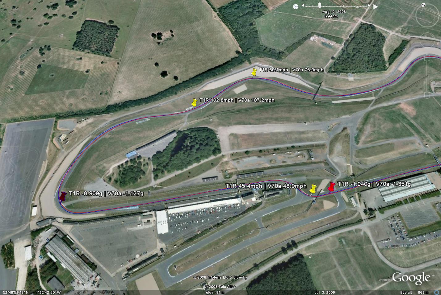 Dies ist der zweite Teaser, den wir für unseren Vergleich von Straßen- und Rennstreckenreifen veröffentlicht haben, aber anstatt nur ein schönes Foto zu zeigen, enthüllen wir diesmal tatsächlich einige der von uns gesammelten Daten.Austragungsort: Donington Park in Derby. Die Konkurrenten: der Kumho V70a und der Toyo T1R . Wie versprochen, gehen wir diesmal nicht zu sehr ins Detail, aber seht euch diese tolle Grafik von Google Earth an, die die Kurvengeschwindigkeiten und G-Kräfte für jeden Reifen anzeigt.