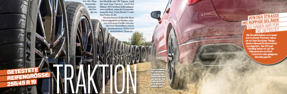 Auto Bild Allrad testete neun Sommerreifen der Größe 255/45 R 19, einer gängigen Bereifung für Allrad-SUVs wie VW Tiguan, Audi Q3, Seat Tarraco, Tesla Model Y und Volvo XC40. Die Tests bei Nässe und Trockenheit wurden auf dem Goodyear-Testgelände in Mireval (Südfrankreich) durchgeführt, während das Offroad-Verhalten auf der Rallye-Strecke von Drive Control im nahegelegenen Monteils geprüft wurde. Zusätzlich zu den Standardtests bei Nässe und Trockenheit wurden die Reifen auch im Gelände auf Schotter und auf Traktionsstrecken wie Gras, Kies und Sand getestet - eine interessante Wahl angesichts der hohen Leistungsfähigkeit und der Sommerausrichtung dieser Produkte!