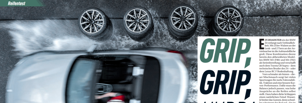 Auto Bild Sportscars testete acht Sommerreifen in den Dimensionen 255/35 R19 und 275/35 R19 - eine gestaffelte Bereifung, die beispielsweise beim BMW Z4, BMW Supra und den BMW M3/M4 Modellen der F-Serie zum Einsatz kommt. Die Tests fanden auf der Wachauring-Rennstrecke in Österreich statt und umfassten Fahrverhalten bei Nässe und Trockenheit, Bremsverhalten, Aquaplaning, Grip auf der Kreisbahn, Geräuschentwicklung und Rollwiderstand. Als Testfahrzeug diente der BMW Z4. Zu den getesteten Herstellern gehörten Continental, Bridgestone, Pirelli, Vredestein, Kumho, Michelin, Hankook und Goodyear.