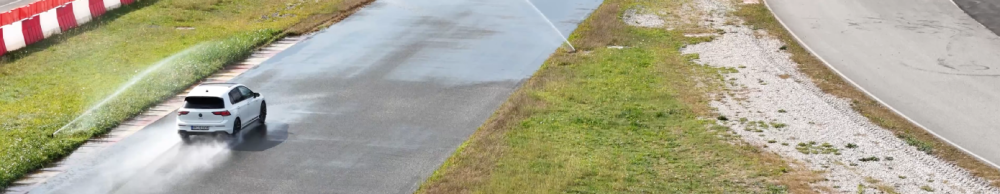 Um den Aquaplaning-Widerstand bei geradliniger Fahrt zu messen, fahre ich mit einer Fahrzeugseite durch eine Wasserrinne mit kontrollierter Tiefe (typischerweise ca. 7 mm), während die andere Seite auf trockenem Asphalt bleibt. Ich fahre mit konstanter Geschwindigkeit hinein und beschleunige dann schrittweise. Aquaplaning beginnt, sobald das Rad in der Wasserrinne einen festgelegten Schlupfwert im Vergleich zum Referenzrad auf der trockenen Seite überschreitet. Üblicherweise führe ich vier Messungen pro Reifensatz durch und bilde den Mittelwert der gültigen Ergebnisse.